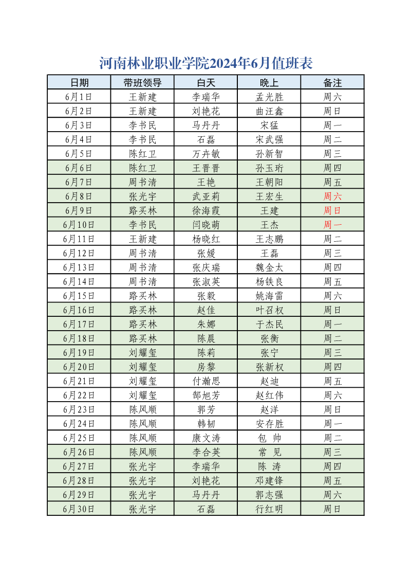 2024年6月值班表
