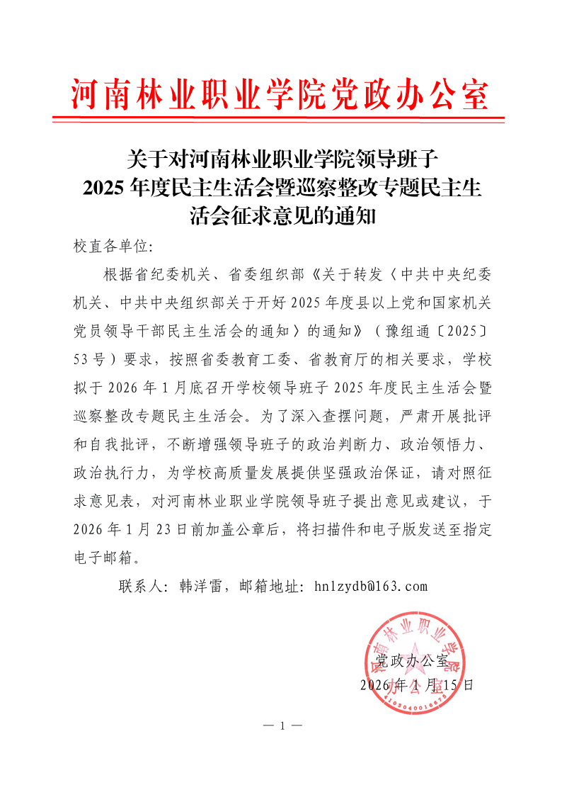 2025年河南林业职业学院领导班子民主生活会征求意见的通知 作者:办公室 来源:办公室 发布时间:2026-01-15 16:53:55 浏览次数: 次 【字体:小 大】 终审:王志鹏 分享到: 【打印正文】