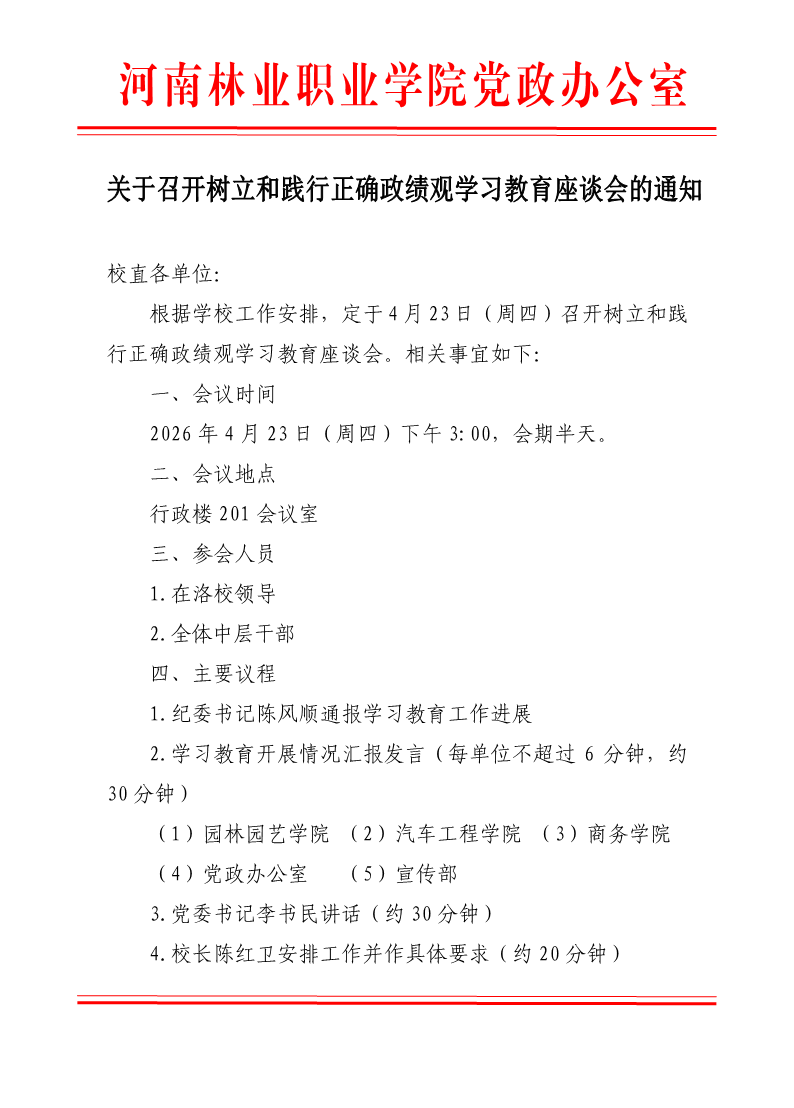 树立和践行正确政绩观学习教育座谈会通知