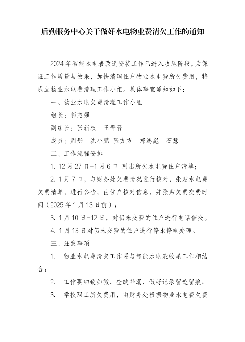 后勤服务中心关于做好水电物业费清欠工作的通知