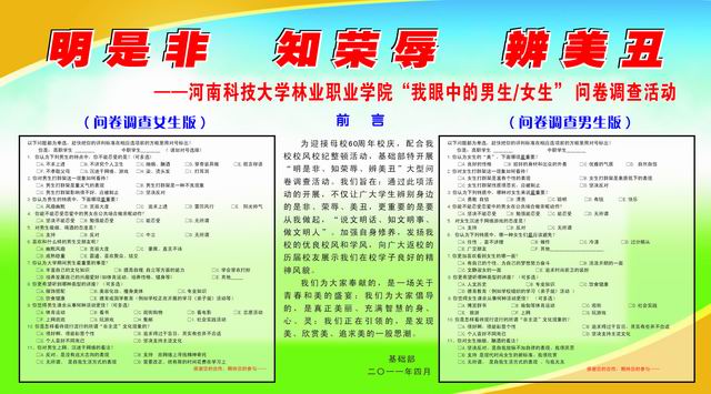 为迎接我校60周年校庆,配合我校校风校纪整顿活动,基础部近日开展“明是非、知荣辱、辨美丑”大型问卷调查活动。
