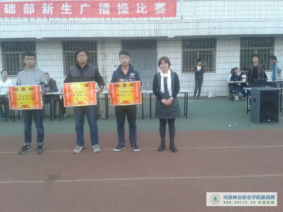 基础部举办2014级新生第九套广播体操比赛 作者:万卉敏 来源:基础部 发布时间:2014-10-24 11:07:45 浏览次数: 次 【字体:小 大】 为展现当代大学生的青春风采,增强同学们的体质,2014年10月23日下午,河南林业职业学院基础教育部在院运动场隆重举行了2014级新生第九套广播操比赛。 本次比赛以班级为单位,分九个方阵组队参加。比赛随着音乐的响起拉开序幕,同学们迈着整齐的步伐走向赛场,动作娴熟到位,张弛有度,充盈着刚健之美。各班同学精神饱满,齐心协力为班集体争取荣誉。 历时两个小时,五年制数控14-1班,高职数控14-1班,五年制汽修14-1班分别获得本次广播体操比赛的前三名。最后,由院学生处刘艳花副处长为获奖班级颁奖。 分享到: 【打印正文】