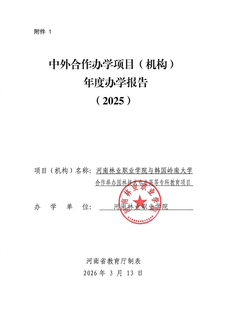 河南林业职业学院与韩国岭南大学合作举办园林技术专业高等专科教育项目2025年度办学报告 作者:教务处 来源:教务处 发布时间:2026-04-09 17:30:00 浏览次数: 次 【字体:小 大】 监督电话:0371-69691769 终审:马丹丹 分享到: 【打印正文】
