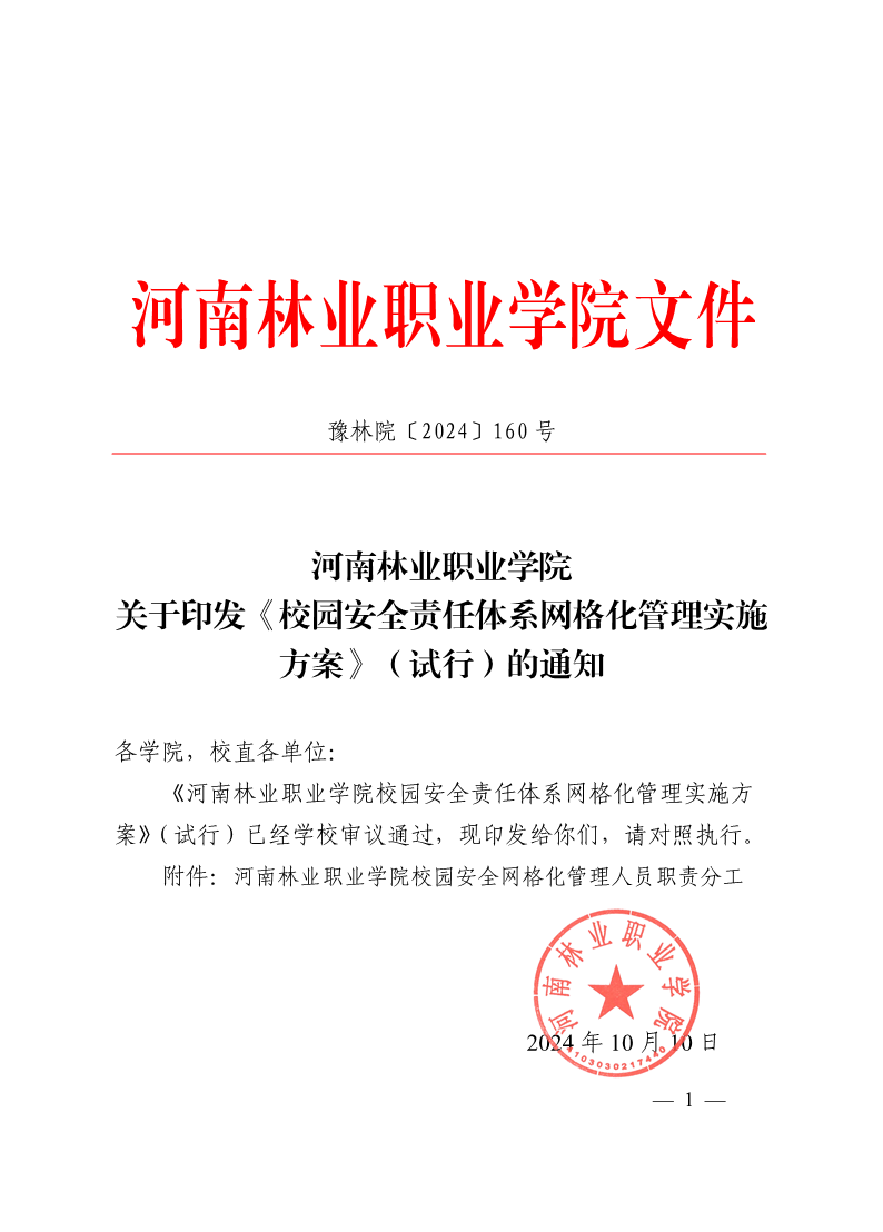 关于《校园安全责任体系网格化管理实施方案》(试行)的通知 作者:姚忠臣 来源:教务处 发布时间:2025-04-13 10:52:18 浏览次数: 次 【字体:小 大】 终审:马丹丹 分享到: 【打印正文】