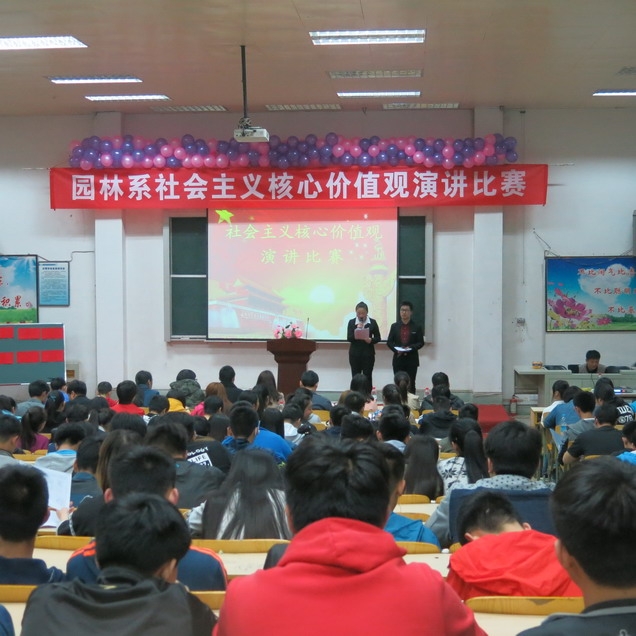 为深入贯彻学习党的十八届四中、五中全会精神和习近平总书记系列讲话精神,推动社会主义核心价值观的学习与践行,园林系团总支于2016年3月30日晚在西阶梯举办了以“社会主义核心价值观”为主题的演讲比赛,比赛现场邀请了园林系党支部书记叶召权老师,院团委王明洋老师,园林系曹晓彩老师,各班辅导员及四系一部团总支副书记来为参赛选手打分指导。