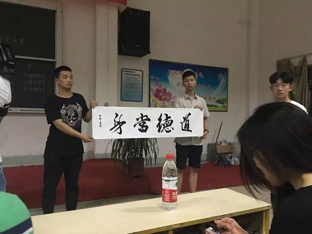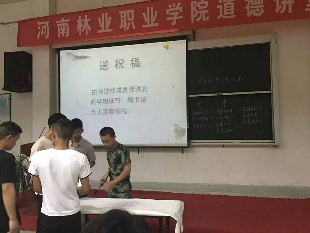 本期道德讲堂以敬业奉献为主题,共分为“唱歌曲、诵经典、讲故事、做反省、学模范、看视频、谈感想、做承诺、送祝福”九个环节。园林系团总支全体成员高声齐唱了经典歌曲《爱的奉献》;王淇和付浩贞两位同学激情地朗诵了关于敬业奉献的一些经典名言;赵胜一同学为大家慷慨激昂的讲述了邱少云舍小己为大家、无私奉献的故事;张宇鹏同学为大家讲述了全国道德模范90后最美潜水员官东的事迹,大家一起观看了2015年感动中国人物评选相关视频、学习了2015年吴锦泉、郎平、张宝艳、秦艳友夫妇的有关事迹;同学们在“谈感悟”环节积极畅谈自己关于敬业、奉献的感想,同时表示要从自身做起,做好身边的点滴小事,努力实现自己的人生价值。最后送祝福的环节由书法社社员贾洪亮同学现场写一幅字“道德当身、不以物惑”为大家送上祝福。现场气氛十分激昂,令人热血沸腾。同学们自发的跟着主持人宣誓立志为祖国做贡献。
