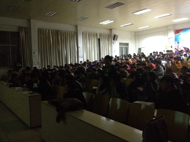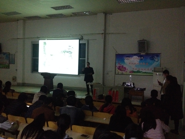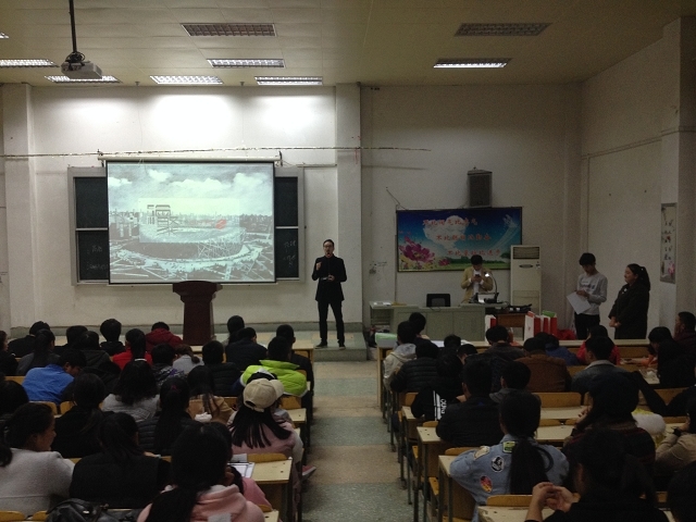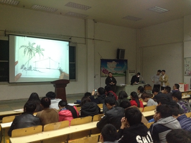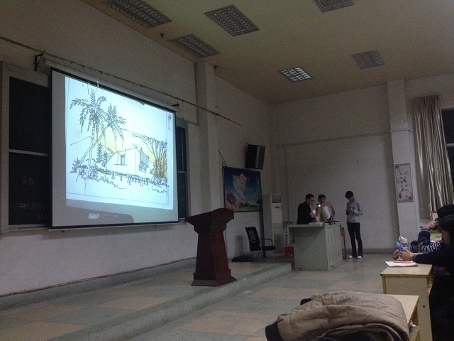在课堂的讲授过程中:第一、李国胜老师从学生现在所学的素描课讲解入手,讲述了大学应该有的学习量,同时也给大家布置了学习任务。第二、李老师以他们设计中心给洛阳伊川杜康酒厂做的职工餐厅的设计图为模板,给学生们介绍了设计角度的选择、设计结构的勾勒以及色彩的调配等一些专业知识。第三、讲授方法,讲解了钢笔画、画线条、立面设计、造型、明暗排线以及画精细稿的方式、马克笔工具的使用。第四、讲解了设计软件工具的使用,如何用专业软件把空间草图设计出来。第五、李老师现场作图并教学生们如何上色。