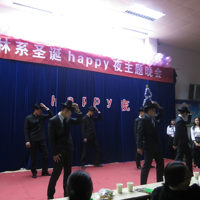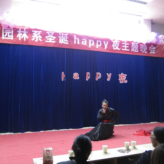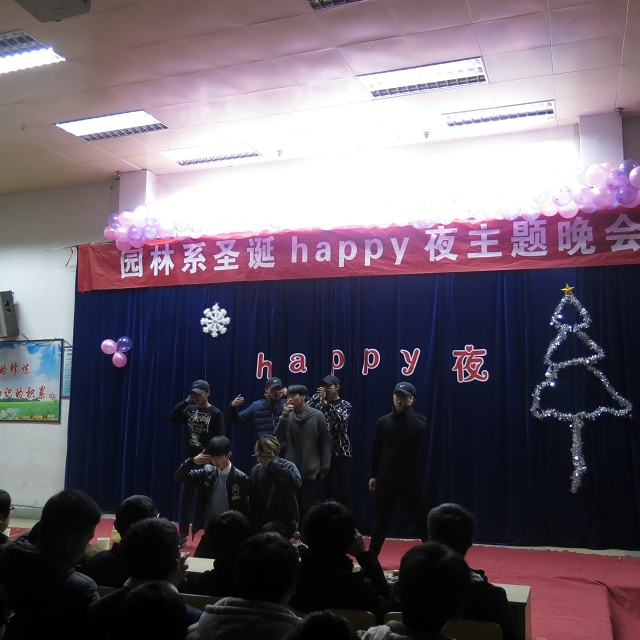 节目开场由校舞社成员的开场舞拉开帷幕,随后,帅气的的主持人登场,活动开始,一首婉转动听的《开始懂了》让全场沉醉,小品《懒汉相亲》,惹得大家捧腹大笑,掌声连连,一段棍术表演展现了男儿的阳刚之气,接着由三位美女合唱的《告白气球》让现场充满了浓浓的浪漫,然后高园林16-4班为大家带来的舞蹈将晚会推向了高潮,中间欢乐地小游戏逗乐了全场观众。随后小品《以貌取人》让大家欢乐的同时又唤起了大家对“人不可貌相”的思考,两位主持人也不甘寂寞,竟在现场进行了相声表演,幽默言语,搞笑动作,都让大家捧腹开怀。接着闫子豪同学一支独舞,引起大家阵阵尖叫。夜幕沉沉,压轴节目《最炫削苹果》将晚会再次推向最高潮,最后全体演员上台为大家送上圣诞祝福,晚会正式落下帷幕。