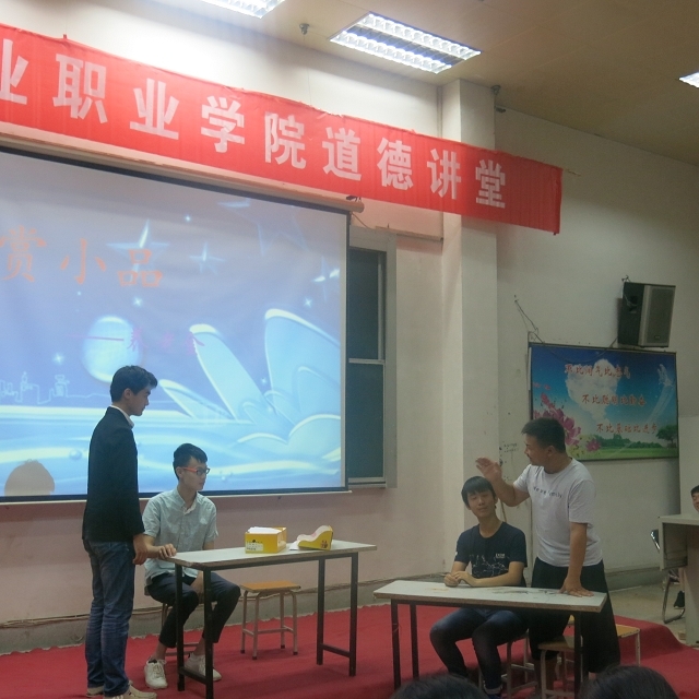 此次道德讲堂以“诚信与友善”为主题,共开展了唱歌曲,诵经典,学模范,看小品,讲故事,谈感受,做承诺,送祝福八个环节。活动在由团总支成员合唱的《相亲相爱》歌曲中正式开始。然后,几位同学为大家带来诗朗诵,他们深情诵读诗词中的经典,诵读诗词中的诚信与友善。接着,大家观看了感动中国人物中关于孙水林、孙东林《信义兄弟》的视频,他们用自己二十年不欠农民工工钱的故事感染了在场所有的人,许多人看的热泪盈眶,情不自禁。稍后同学们带来了小品《养老金》,我们在阵阵笑声中学会了很多,只有诚信对人才能在社会上立足,诚信经营才能干出一番事业。接下来的讲故事环节,《孔融让梨》和《诚信助人》两个中外诚信故事进一步证明了诚信的重要。经过了前几个环节,在谈感受环节中,同学们积极踊跃发言,对诚信和友善都有不同的见解与感悟。接着大家全体起立,共同做出了“诚信待人,友善待人”的承诺。然后陈涛老师围绕活动的主题“诚信与友善”进行了精彩的讲话,多层此、多方面、多角度得指出了同学们在现阶段对传统道德理解的不足。并鼓励大家在以后认真践行大学生义务,积极传承传统美德,诚信待人,友善待人。最后曹晓彩老师送上了对祖国、对大家诚挚的祝福,至此活动圆满结束。