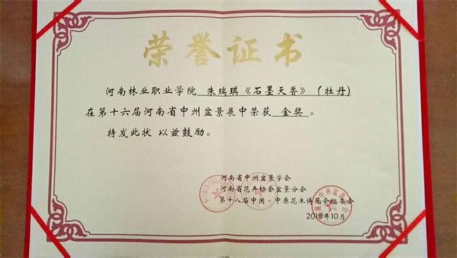 经过专家评定及为期两周的展览,2018年10月7日,大奖揭晓,我院获得河南省第十六届中州盆景展展馆布置金奖,朱瑞琪老师牡丹盆景作品《石墨天香》获得金奖,我院师生布置的《国色天香》荣获景点布置一等奖,学院获得突出贡献奖。