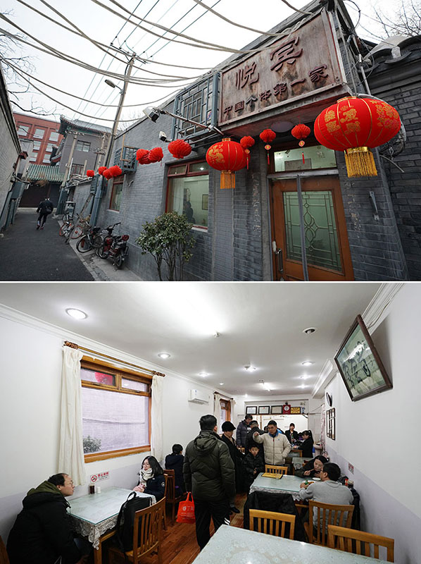 拼版照片:上图为改革开放后中国的第一家个体饭馆——中国美术馆正门对面翠花胡同里的悦宾饭店;下图为顾客在悦宾饭店里就餐(2019年1月29日摄)。新华社记者 鞠焕宗 摄