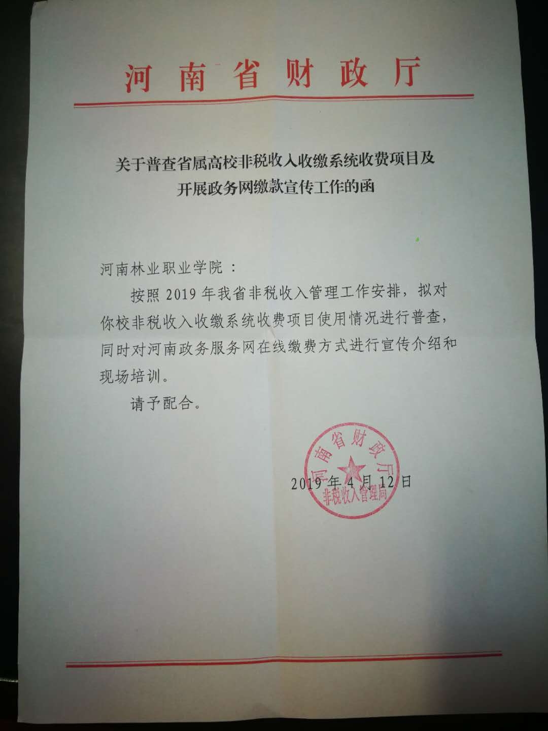 2019年4月16日,河南省财政厅非税收入管理局黄艳等同志一行三人到我院调研指导工作。期间对我院非税收入征缴工作以及收缴系统收费项目使用情况进行了普查,并对河南政务服务网在线缴费方式进行宣传和现场培训。副院长刘宗利、财务处长宋猛以及相关财务人员参加培训并积极配合普查。