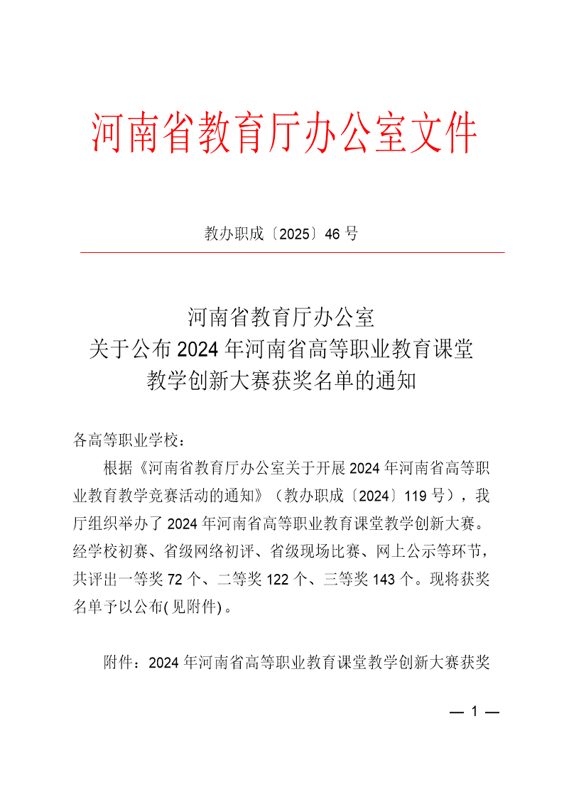 关于公布2024年河南省高等职业教育课堂教学创新大赛获奖名单的通知