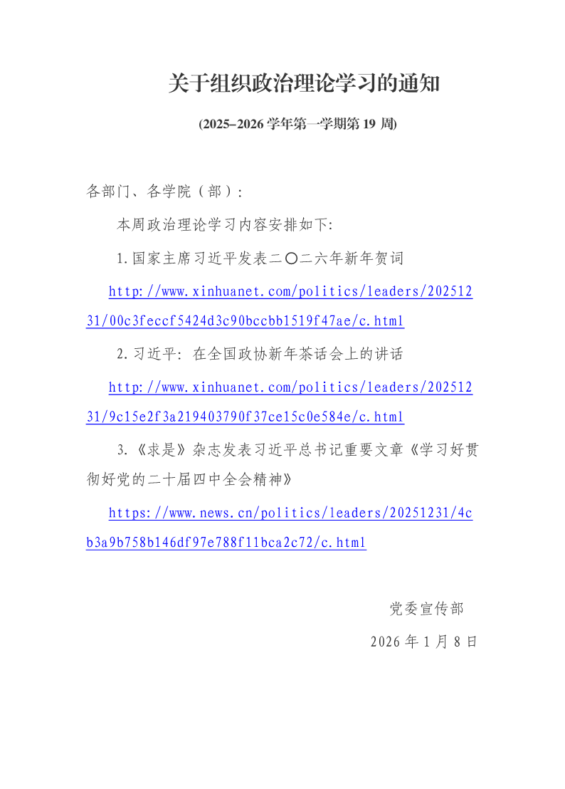 2025年政治理论学习(2025-2026学年第一学期第19周) 作者:党委宣传部 来源:党委宣传部 发布时间:2026-01-08 14:43:04 浏览次数: 次 【字体:小 大】 政治理论学习(第19周).pdf政治理论学习(第19周).pdf 终审:刘瑶 分享到: 【打印正文】