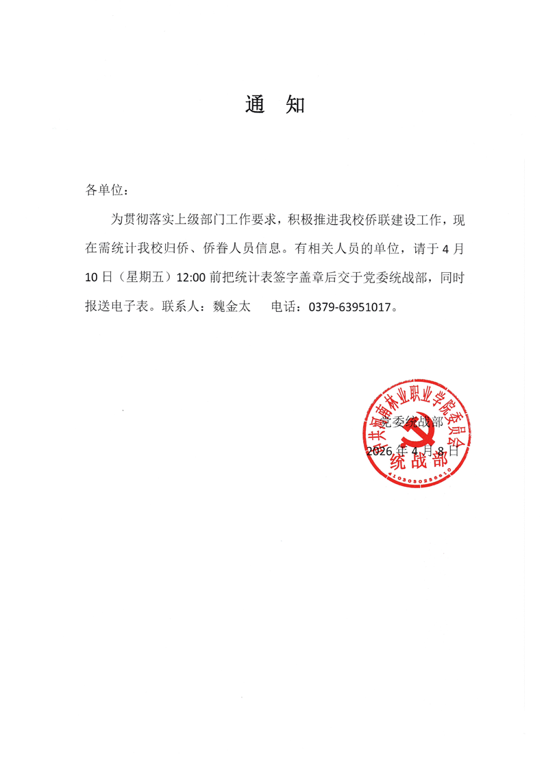 关于统计归侨侨眷人员信息的通知 作者:魏金太 来源:党委统战部 发布时间:2026-04-08 10:36:33 浏览次数: 次 【字体:小 大】 2026年归侨侨眷统计表.xlsx归侨、侨眷等认定范围.png 分享到: 【打印正文】