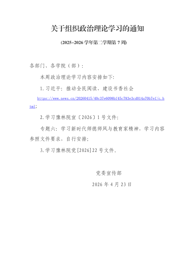 2026年政治理论学习(2025-2026 学年第二学期第 7 周) 作者:党委宣传部 来源:党委宣传部 发布时间:2026-04-23 14:53:38 浏览次数: 次 【字体:小 大】 分享到: 【打印正文】