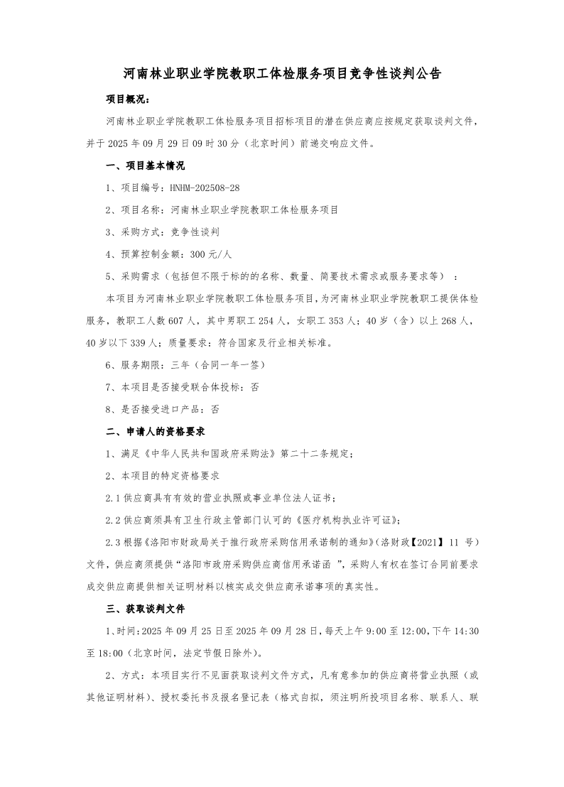 河南林业职业学院教职工体检服务项目竞争性谈判公告