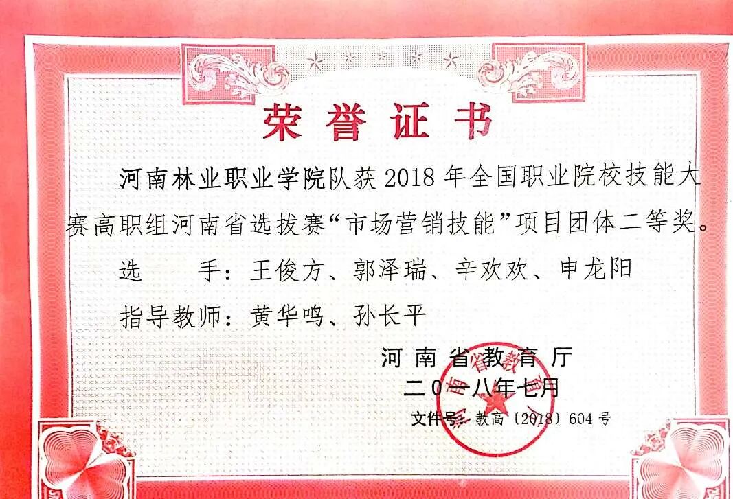本专业学生曾在河南省高职组市场营销专业技能大赛中获得二等奖一次,三等奖三次,在“邮储杯”全国大学生网络商务创新应用大赛中获全国总决赛二等奖两次,在牡丹花会实习期间多名学生被企业评为“优秀实习生”。