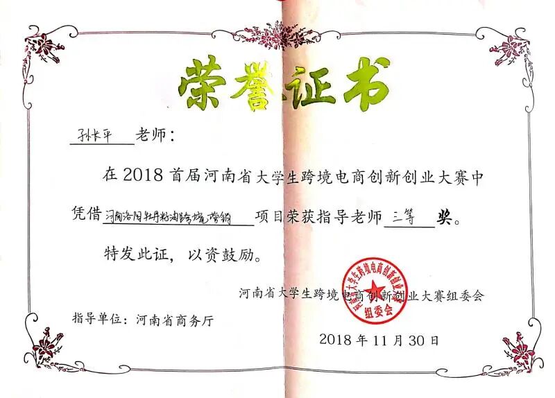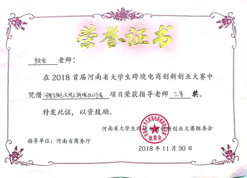 2018年,荣获河南省首届跨境电商创新创业大赛三等奖两项。