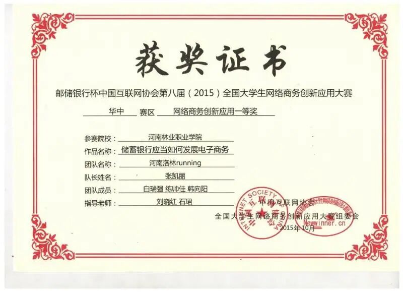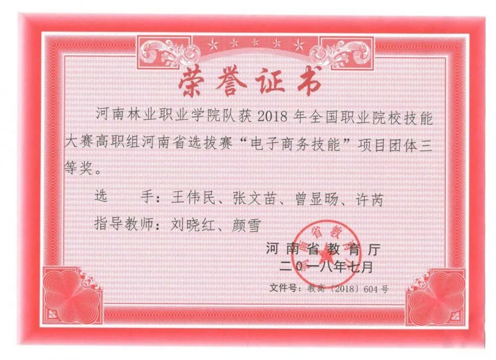 本专业学生曾在河南省高职组电子商务专业技能大赛中获得三等奖三次;在河南省“互联网+”大学生创新创业大赛中获得三等奖一次;在“邮储杯”全国大学生网络商务创新应用大赛中获全国总决赛二等奖、华中赛区一等奖、华中赛区二等奖各一次。