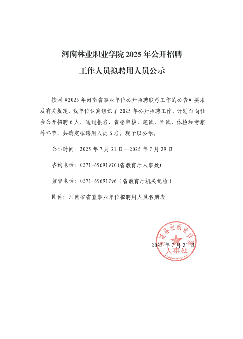 河南林业职业学院2025年公开招聘工作人员拟聘用人员公示