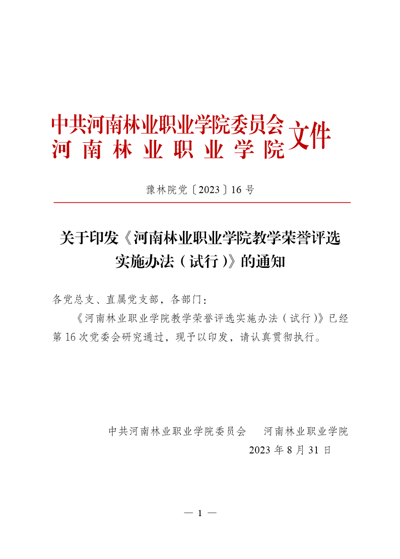 豫林院党〔2023〕16号关于印发《河南林业职业学院教学荣誉评选办法(试行)》的通知 作者:党政办 来源:党政办 发布时间:2024-04-28 08:37:30 浏览次数: 次 【字体:小 大】 终审:韩洋雷 分享到: 【打印正文】