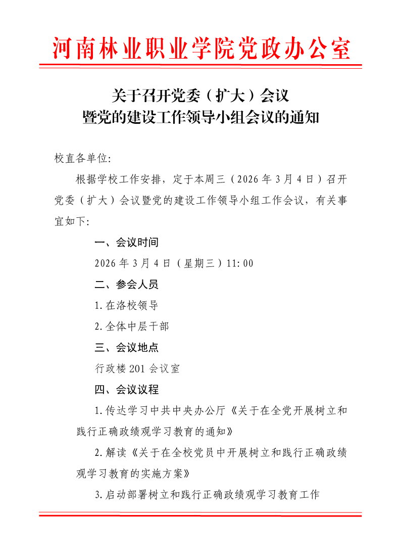 关于召开党委扩大会议暨党的建设工作领导小组会议的通知 作者:办公室 来源:办公室 发布时间:2026-03-03 10:42:10 浏览次数: 次 【字体:小 大】 终审:王志鹏 分享到: 【打印正文】