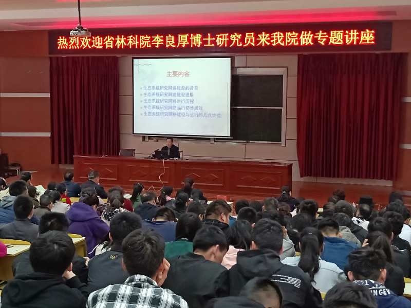 2019年3月22日,我院邀请河南省林业科学研究院林业研究所所长李良厚博士研究员做“河南省典型生态系统定位研究网络建设与运行”专题讲座,学院及市林业局领导、相关专业技术人员、师生代表二百余人齐聚一堂,共同聆听专家专题讲座。学院院长宋宏伟主持讲座会。