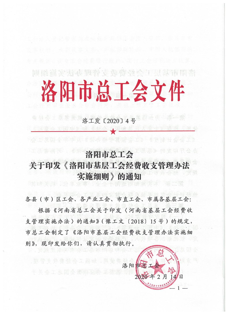 洛阳市基层工会经费收支管理办法实施细则 (洛工发[2020]4号) 作者:朱娜 来源:工会办公室 发布时间:2025-04-14 16:39:06 浏览次数: 次 【字体:小 大】 终审:朱娜 分享到: 【打印正文】