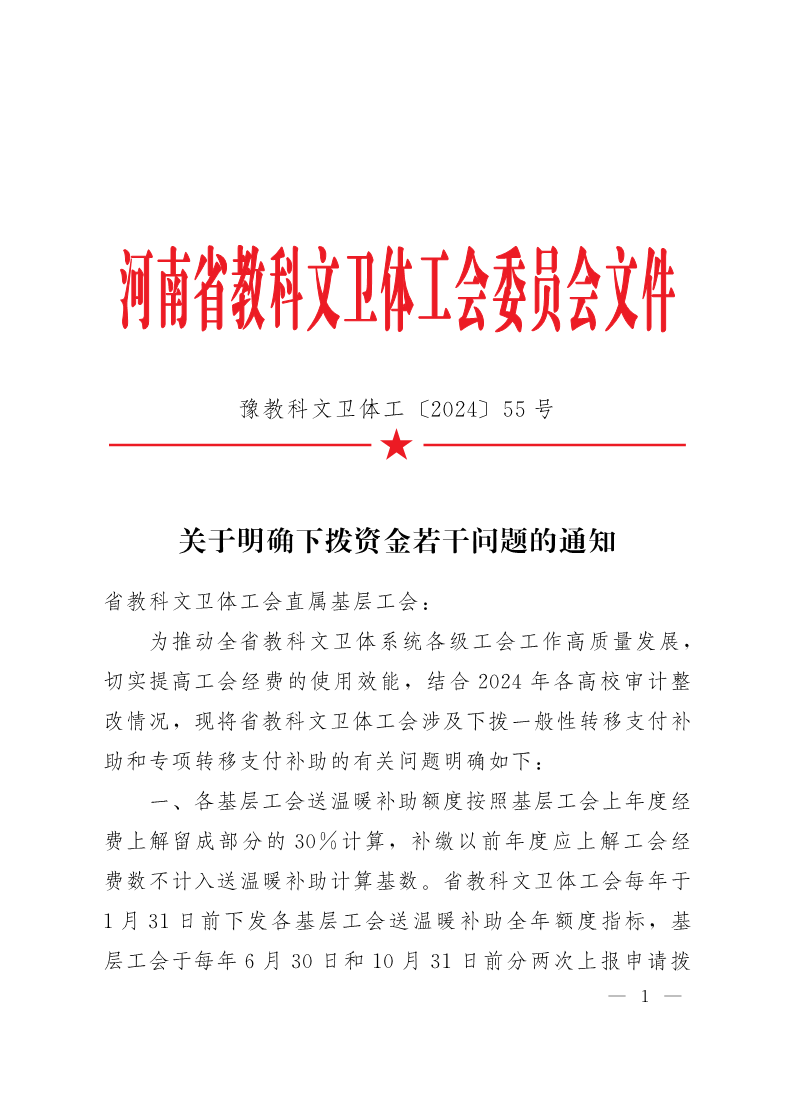 关于明确下拨资金若干问题的通知(豫教科文卫体工【2024】55号) 作者:朱娜 来源:工会办公室 发布时间:2025-06-16 16:57:48 浏览次数: 次 【字体:小 大】 终审:朱娜 分享到: 【打印正文】