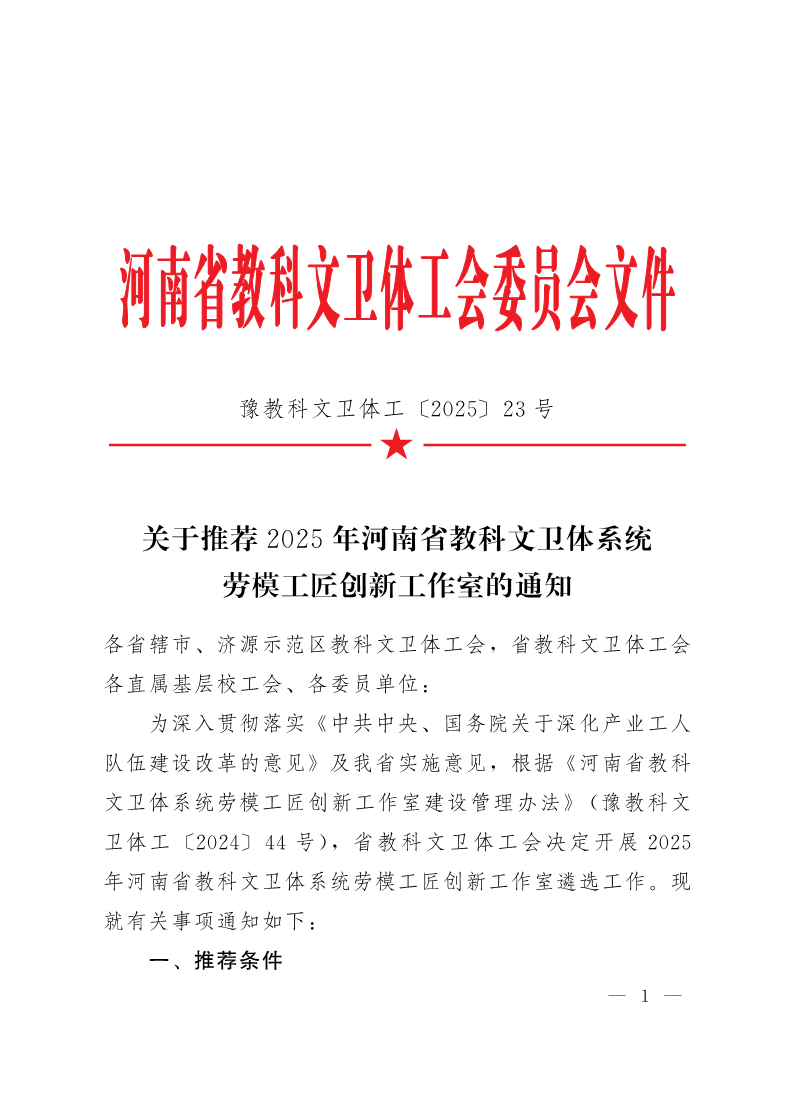 关于推荐2025年河南省教科文卫体系统劳模工匠创新工作室的通知 作者:朱娜 来源:工会办公室 发布时间:2025-11-05 10:49:50 浏览次数: 次 【字体:小 大】 终审:朱娜 分享到: 【打印正文】