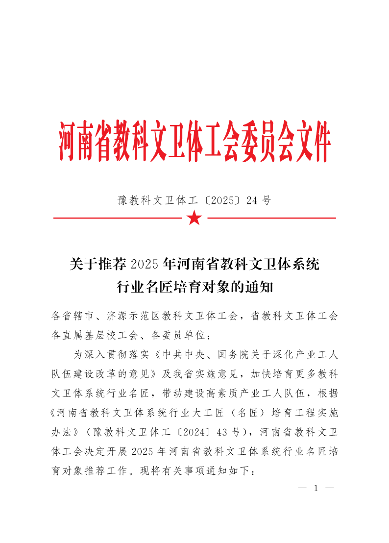 关于推荐2025年河南省教科文卫体系统行业名匠培育对象的通知
