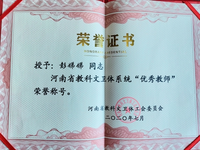 近日,河南省教科文卫体工会下发了《关于命名省教科文卫体系统“最美医生”“最美护士”“最美教师”的通知》(豫教科文卫体工[2020]20号),我院教师彭娣娣荣获省教科文卫体工会“优秀教师”荣誉称号。