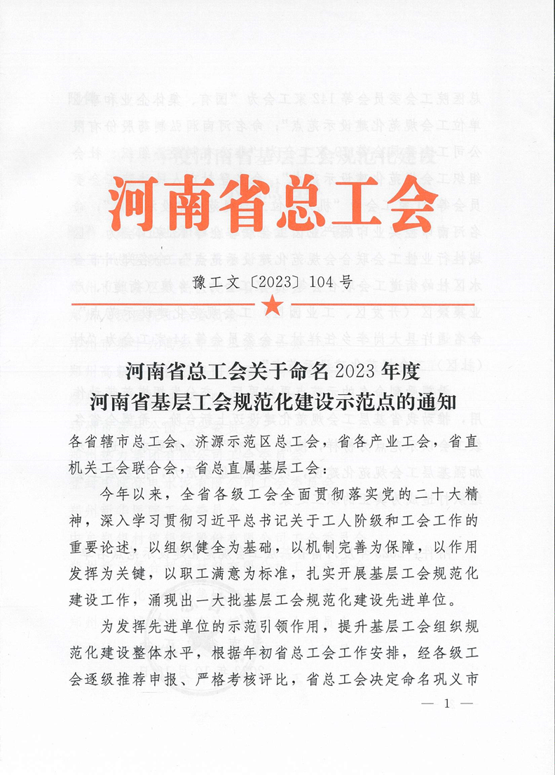 10月16日,河南省总工会印发《河南省总工会关于命名2023年度河南省基层工会规范化建设示范点的通知》,我校工会荣获“2023年度河南省基层工会规范化建设示范点”称号。