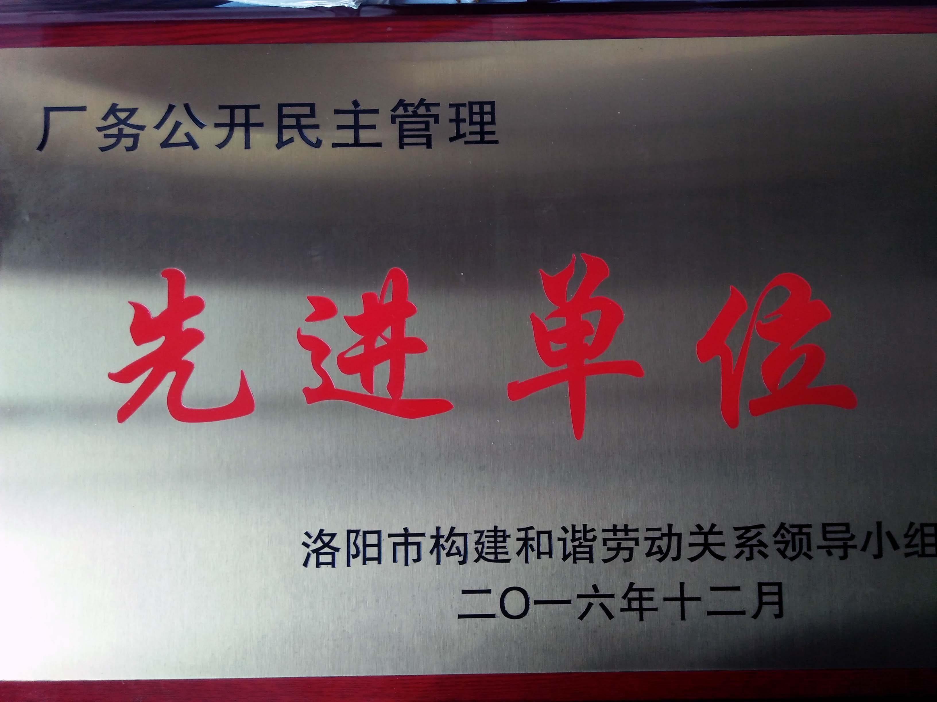 日前,洛阳市构建和谐劳动关系领导小组通过评审和社会公示,评选表彰了近年来在全市厂务公开民主管理工作中取得优异成绩的单位和个人,经过逐级评选推荐,我院被授予“厂务公开民主管理工作先进单位”荣誉称号。