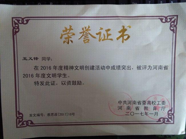 2016年以来,全省教育系统深入学习贯彻党的十八大、十八届三中、四中、五中、六中全会和习近平总书记系列重要讲话精神,以培育和践行社会主义核心价值观为根本,围绕立德树人根本任务,深入开展中国特色社会主义和中国梦宣传教育、社会主义核心价值观学习教育和以“创建文明学校、创建文明班级、争当文明教师、争当文明学生”为载体的教育系统“两创两争”群众性精神文明创建活动。我院积极响应,同时参加2016年度全省教育系统“两创两争”活动先进集体和先进个人评选活动。近日,省委高校工委、省教育厅发布关于表彰2016年度精神文明建设先进集体和先进个人的决定,我院园林系教师张丹爱岗敬业,工作认真踏实,积极培育和践行社会主义核心价值观,在精神文明创建活动中表现突出,被评为2016年度“河南省文明教师”。同时,我院孙思航、王义锋两位同学同学因成绩优异、能力突出被评为河南省2016年度文明学生。