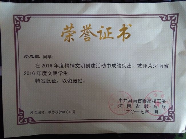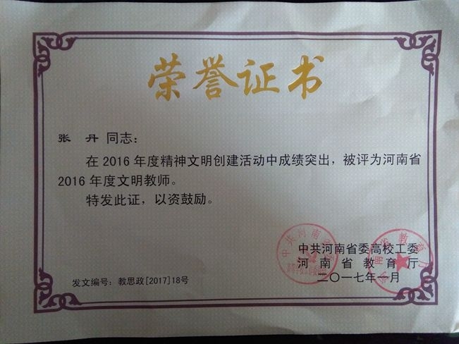 2016年以来,全省教育系统深入学习贯彻党的十八大、十八届三中、四中、五中、六中全会和习近平总书记系列重要讲话精神,以培育和践行社会主义核心价值观为根本,围绕立德树人根本任务,深入开展中国特色社会主义和中国梦宣传教育、社会主义核心价值观学习教育和以“创建文明学校、创建文明班级、争当文明教师、争当文明学生”为载体的教育系统“两创两争”群众性精神文明创建活动。我院积极响应,同时参加2016年度全省教育系统“两创两争”活动先进集体和先进个人评选活动。近日,省委高校工委、省教育厅发布关于表彰2016年度精神文明建设先进集体和先进个人的决定,我院园林系教师张丹爱岗敬业,工作认真踏实,积极培育和践行社会主义核心价值观,在精神文明创建活动中表现突出,被评为2016年度“河南省文明教师”。同时,我院孙思航、王义锋两位同学同学因成绩优异、能力突出被评为河南省2016年度文明学生。