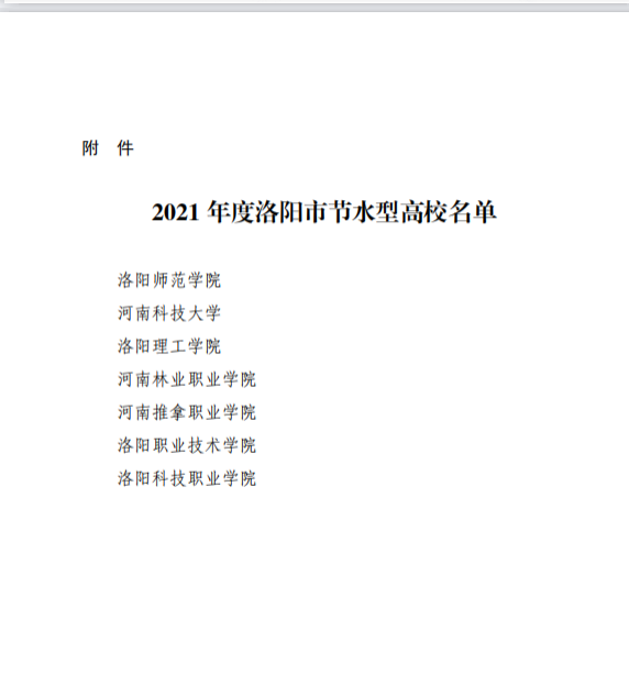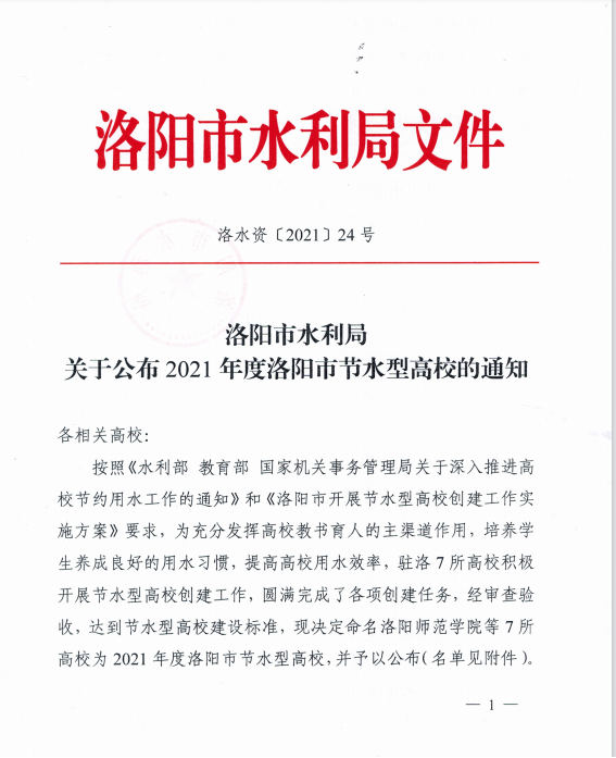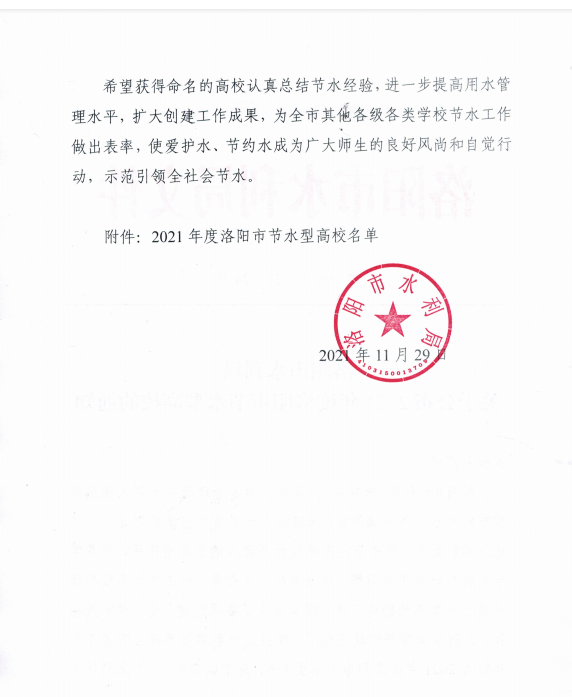 近日,洛阳市水利局发文公布“2021年度洛阳市节水型高校”名单,我院喜获此项荣誉。