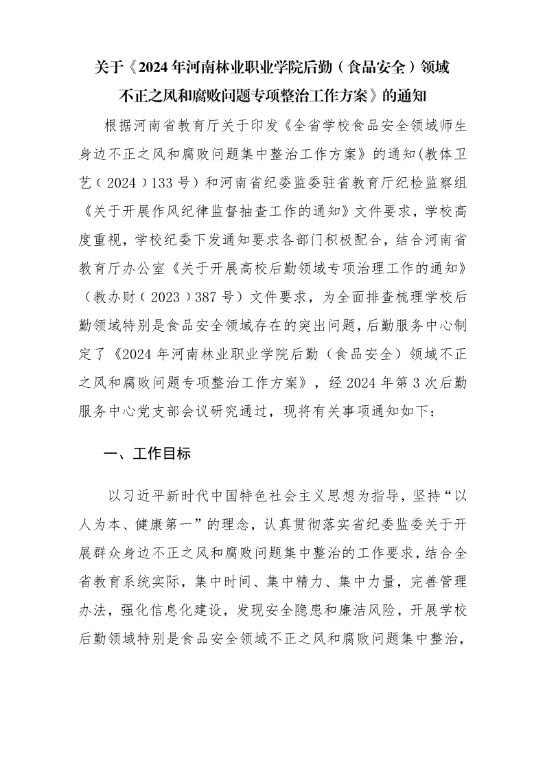 关于2024年河南林业职业学院后勤领域(食品安全领域)师生身边不正之风和腐败问题集中整治工作方案的通知 作者:综合科办公室 来源:后勤服务中心 发布时间:2024-05-30 11:12:39 浏览次数: 次 【字体:小 大】 终审:王晋晋 分享到: 【打印正文】