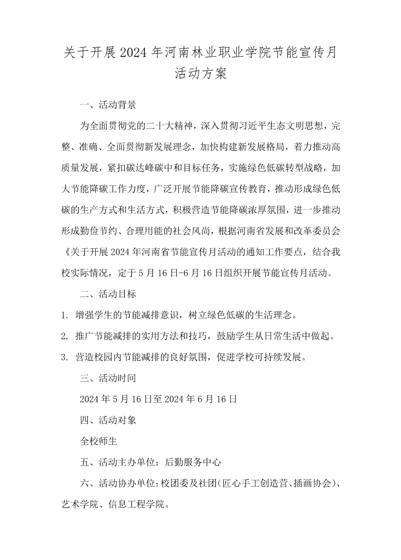 关于开展2024年河南林业职业学院节能宣传月活动方案 作者:综合科办公室 来源:后勤服务中心 发布时间:2024-05-30 11:14:18 浏览次数: 次 【字体:小 大】 终审:王晋晋 分享到: 【打印正文】