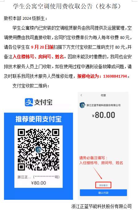 温馨提示 | 学生公寓空调使用费办理须知(校本部) 作者:综合科办公室 来源:后勤服务中心 发布时间:2024-09-15 18:35:25 浏览次数: 次 【字体:小 大】 亲爱的校本部2024级同学:大家可以根据《学生公寓空调使用费收取公告》完成宿舍空调使用费缴费,确保享受舒适的宿舍环境。1、《学生公寓空调使用费收取公告》在学校后排小平房15号房间门口及各个宿舍楼大厅进行张贴,在网页下方也可查看。2、请同学们在规定的时间内完成缴费,以免影响空调的正常使用。3、缴费前请务必确认自己的房间号及个人信息无误,以免发生误缴。4、如对缴费金额或过程有任何疑问,欢迎随时向任师傅咨询,任师傅:13698841794 终审:王晋晋 分享到: 【打印正文】