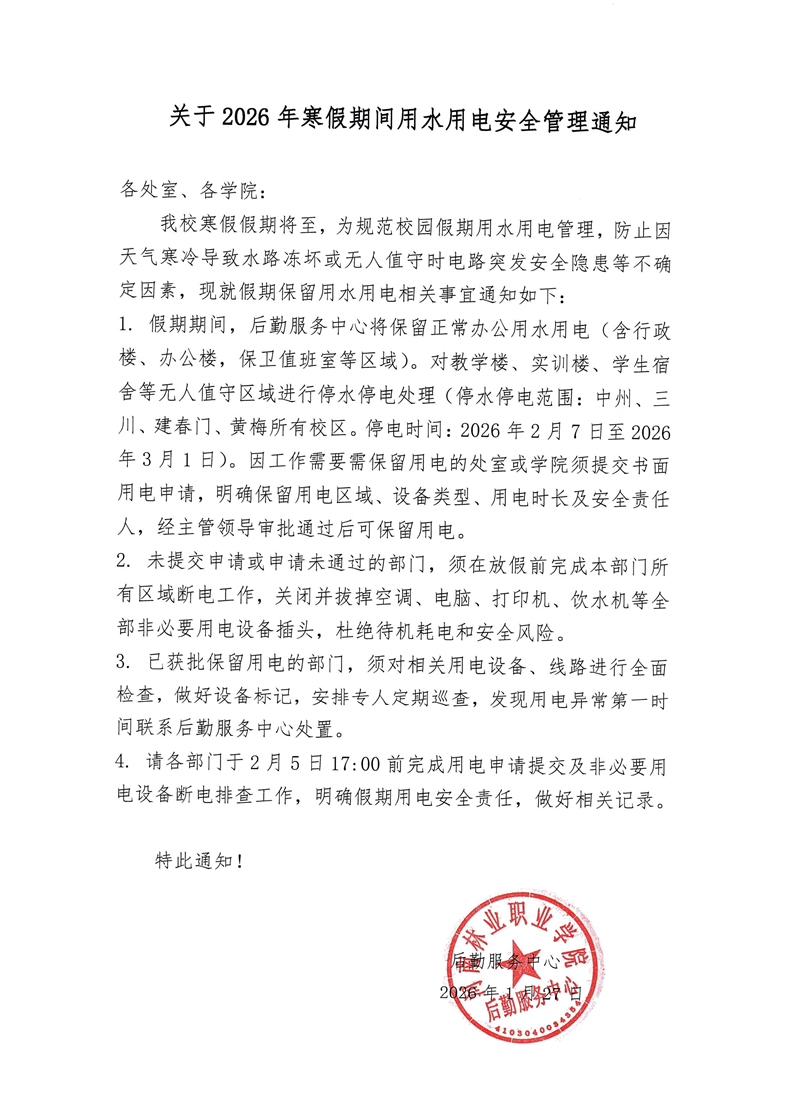 关于2026年寒假期间用水用电安全管理通知 作者:沈小鹏 来源:后勤服务中心 发布时间:2026-01-27 08:27:26 浏览次数: 次 【字体:小 大】 河南林业职业学院假期保留用电申请表.docx 分享到: 【打印正文】