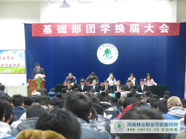 2014年12月16日晚19:30,河南林业职业学院基础教育部团总支、学生会换届大会在学院办公楼东阶梯教室隆重召开。基础部主任兼党支部书记李瑞华、基础部副主任马建国、基础部团总支书记包帅、基础部有关老师及各班班主任出席了本次大会。