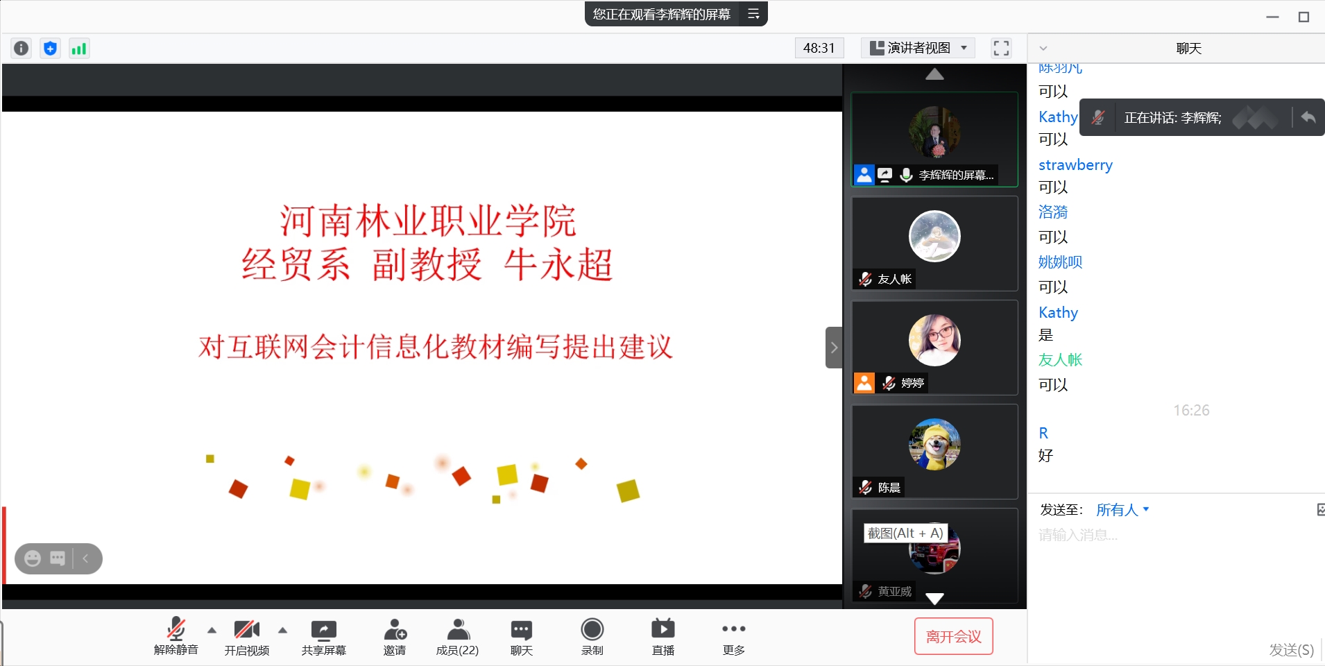 为了更好的实施教改,使书本与实践相结合,编写出更加能够与时代相结合,将科技创新、教学改革创新融入其中,提高教材的实战性和适用性的教材。深化校企合作,企业与学校相结合,共同打造高度应用性学科教材。河南林业职业学院经贸系于2021年2月6日下午以线上会议--腾讯会议方式召开会计信息化实战教材启动会。