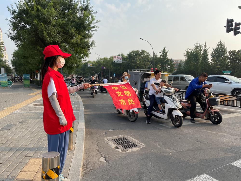 2021年9月13日上午7:30至8:30早高峰和下午6:30至7:00晚高峰期间,经贸系党总支8位党员教师在中州东路与启明南路交叉口开展文明交通劝导活动。她们站在路口,积极发挥指引劝导作用,红灯亮起时及时将行人和车辆劝阻在停止线内,维护道路交通有序文明进行。