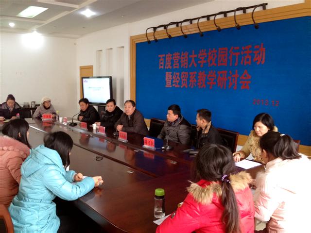 这次活动由经贸系组织,致力于让具有“百度大学现代化认知”的教师走进校园扩宽电子商务及市场营销专业教师的专业知识、与时代接轨、与时俱进以补充在教学中的不足。两位百度大学的老师精彩的演讲赢得了再做老师的阵阵掌声。会议上我系老师与百度大学的老师从教学到学生的就业方方面面进行了热烈的讨论。百度大学的老师也对我系的教学工作给予了很高的评价。