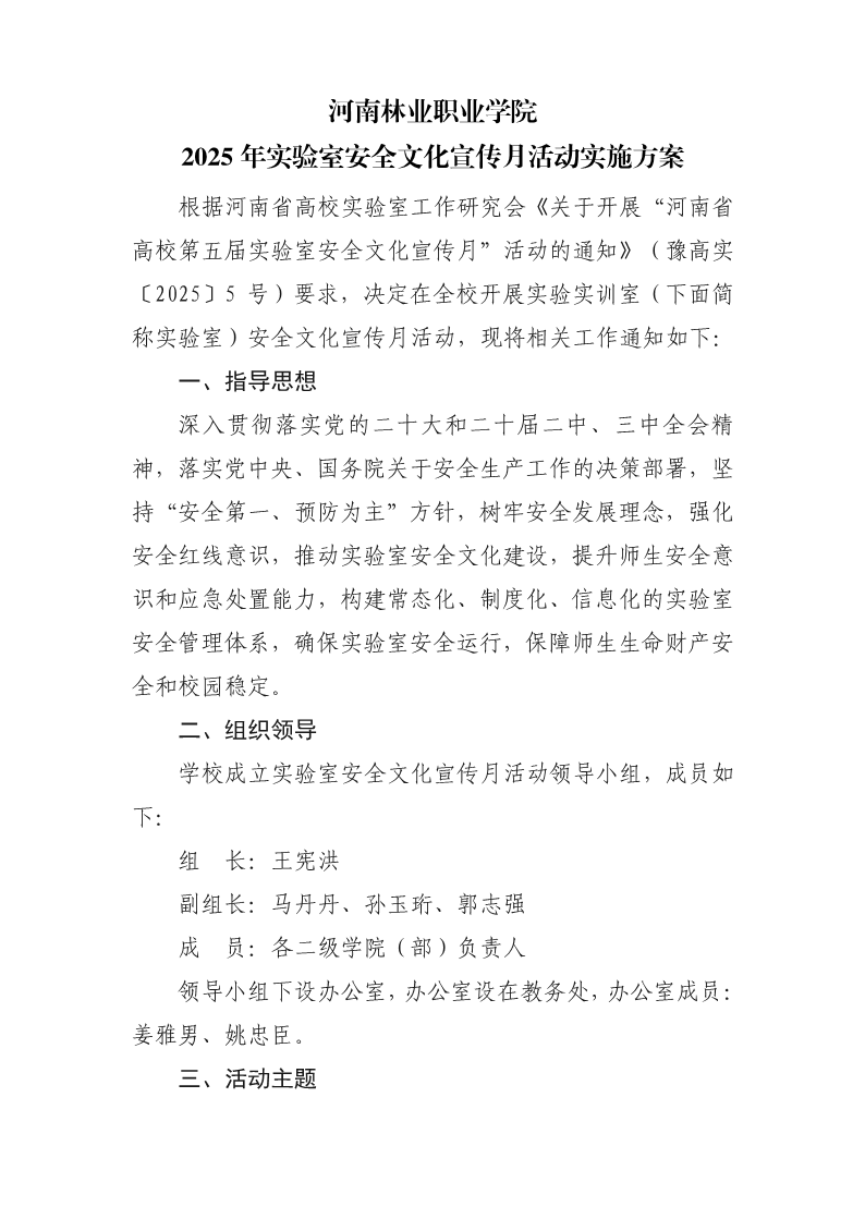河南林业职业学院 2025年实验室安全文化宣传月活动实施方案 作者:姜雅男 来源:教务处 发布时间:2025-10-20 08:44:58 浏览次数: 次 【字体:小 大】 终审:马丹丹 分享到: 【打印正文】