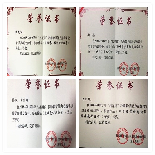 在教学设计赛项的比赛中,王亚辉的《从香菱学诗看诗词格律》获得二等奖,在课堂教学赛项的比赛中,赵潇的《歌唱学堂乐歌感悟家国情怀——送别音乐赏析》获三等奖,周慧丽的《酒店客人投诉处理程序》获三等奖,在实训教学赛项的比赛中,刘冰、王彩丽团队的《原始凭据的审核》获三等奖。