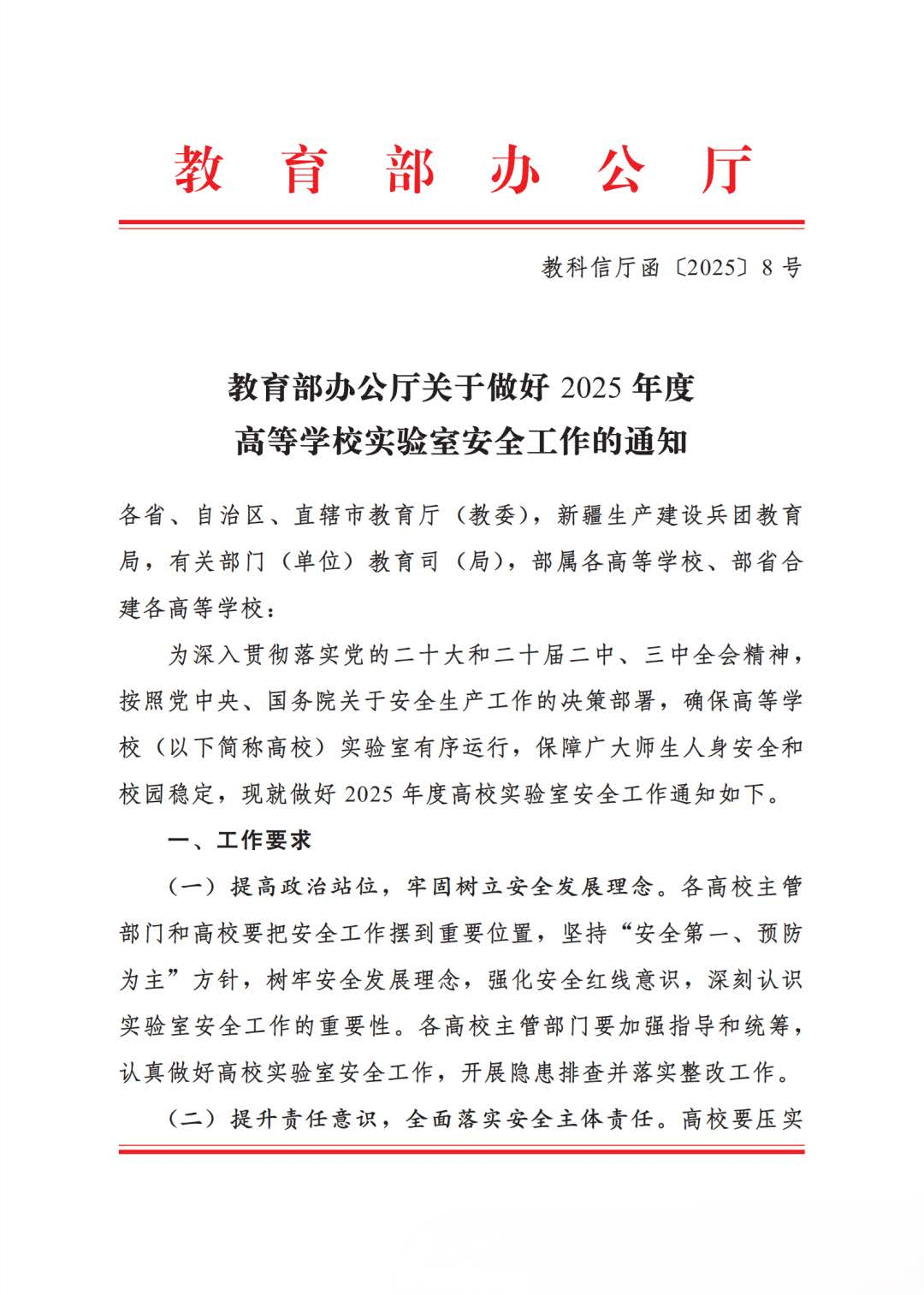 教育部办公厅关于做好2025年度高等学校实验室安全工作的通知 作者:姚忠臣 来源:教务处 发布时间:2025-04-14 17:37:45 浏览次数: 次 【字体:小 大】 终审:马丹丹 分享到: 【打印正文】