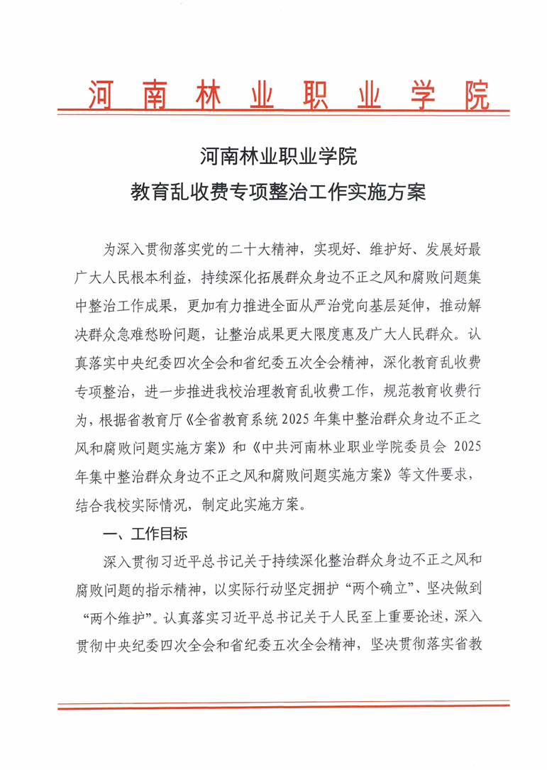 河南林业职业学院教育乱收费专项整治工作实施方案